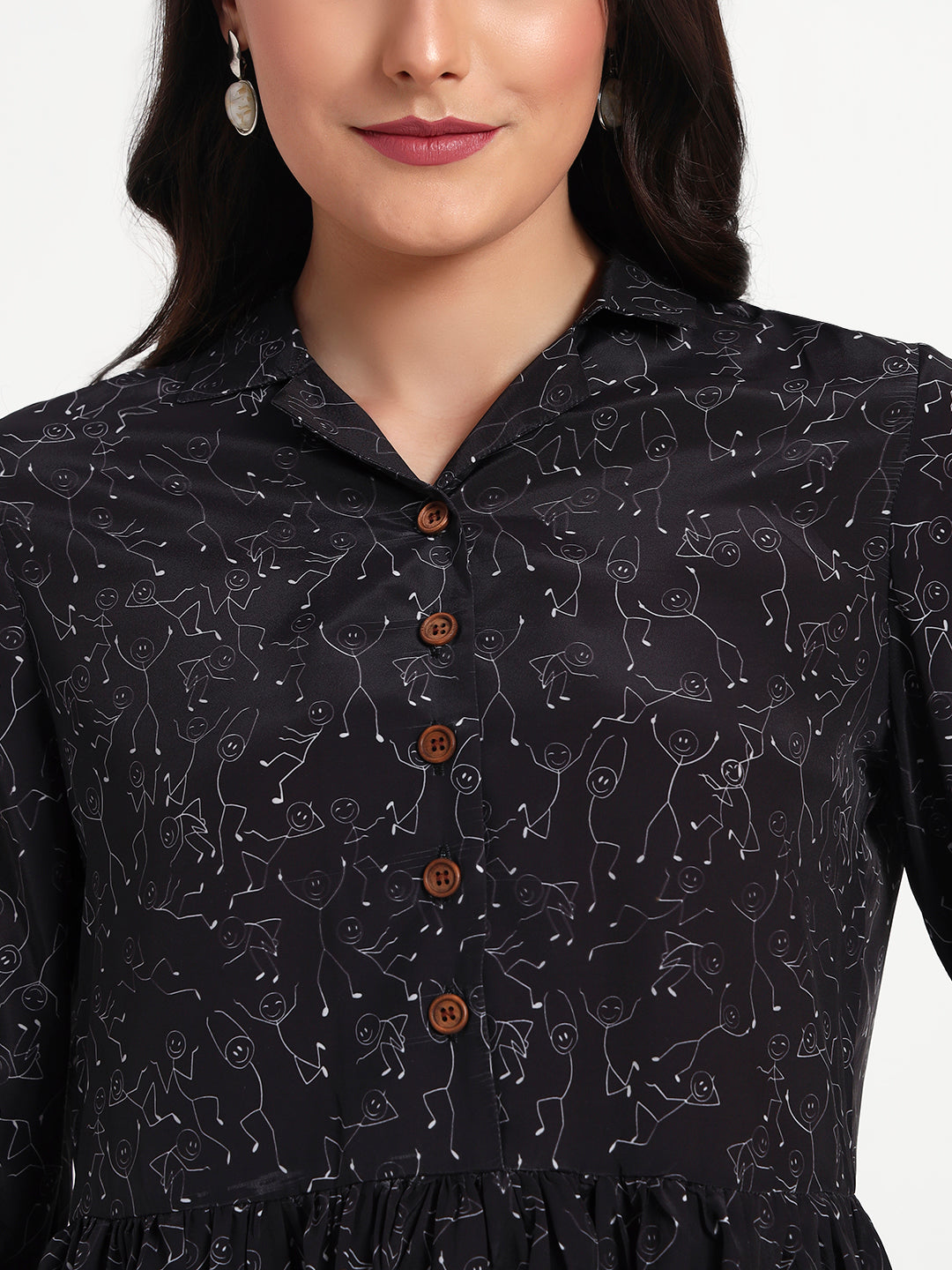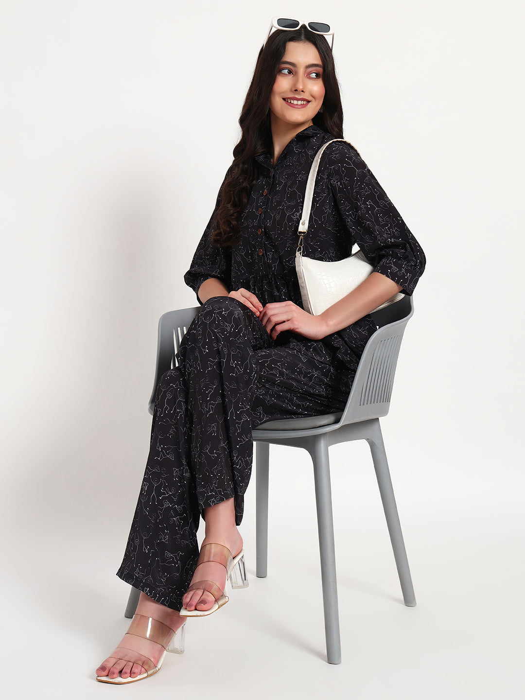Elevate your everyday look with this sleek black co-ord set featuring a subtle abstract line print and a flattering peplum silhouette. The top is designed with 3/4 sleeves, a button-down front, and a soft flare at the waist that adds effortless charm. Paired with relaxed straight-leg pants that include two deep pockets for practicality, this set is as functional as it is fashionable. Whether you're lounging in style or stepping out for a casual day, this outfit strikes the perfect balance between comfort and chic.